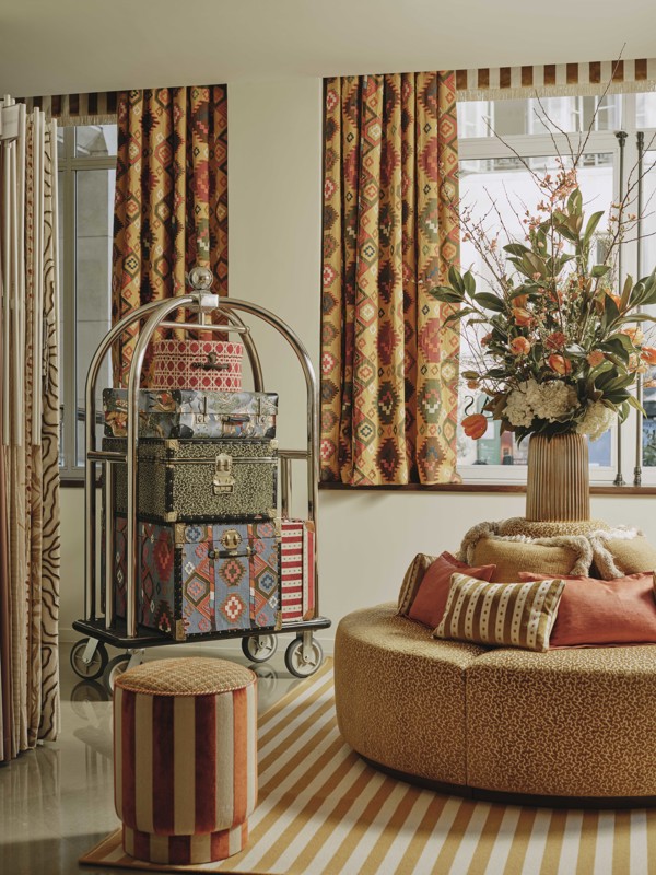 Manuel Canovas adopte l’esthétique "More is More" en introduisant des couleurs audacieuses, des tissus opulents et des détails de qualité.